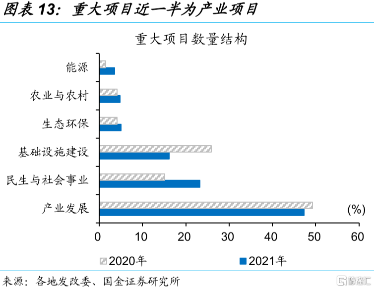 新基建和产业协同发力,企业市场化投资行为助力维稳。“新旧动能”切换过程中的稳增长,不只依靠传统基建,还有产业属性更强的新基建,及产业投资等“抓手”。新基建投资规模相对较小、占传统基建比重可能在5-10%左右,但未来发展空间大、是产业升级的基础,仅信息网络基础设施“十四五”计划投资达3.7万亿元、较“十三五”增长48%。除基建外,政策更加重视对产业培育,以重大项目等依托、加大产业投资。相较于传统基建,新基建和产业项目,对财政资金依赖度低,更多依靠企业市场化融资,容易形成有效投资。