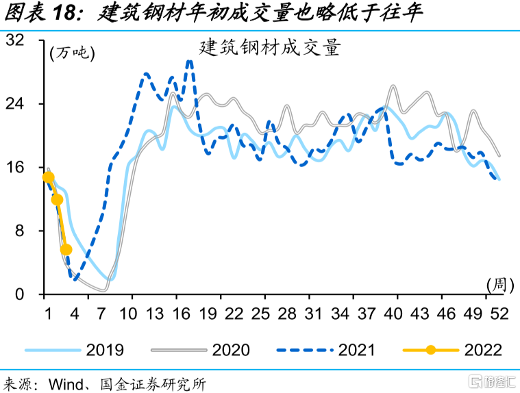 “政策底”夯实下,年初经济产、需低迷,或缘于疫情反复等影响下的稳增长传导时滞拉长。高频指标显示,全国水泥出货率同比下降15.1%,建筑钢材成交平淡、不及2021年同期水平,皆指向稳增长的效果尚未明显显现。从地方债等政府募资,到资金落到项目形成实物工作量,存在一定时滞;而疫情反复、人员提前返乡等影响下,项目开工等可能偏慢,进而导致稳增长传导的时滞拉长,对年初经济的提振尚未明显显现。