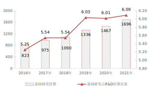 智通财经APP获悉,1月26日,国家统计局发布2021年我国R&D经费数据。初步测算,2021年我国全社会研究与试验发展(R&D)经费投入为27864亿元,比上年增长14.2%,扣除价格因素,实际增长9.4%;R&D经费与国内生产总值(GDP)之比达到2.44%,比上年提高0.03个百分点[1]。其中,基础研究经费为1696亿元,增长15.6%,增速比全社会R&D经费快1.4个百分点;占R&D经费比重为6.09%,比上年提高0.08个百分点。