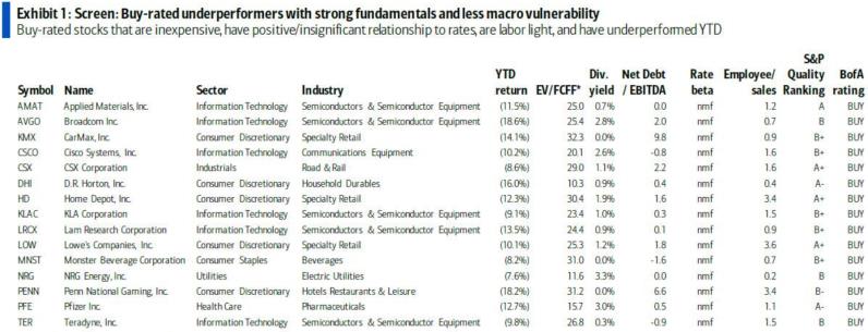 美银策略师表示,在标普500指数今年以来表现落后的196只股票中,她提取了一个简短的名单。这15家公司具有强大的基本面和较少的宏观脆弱性,都是给予买入评级的股票。它们的表现低于标普500指数,提供较高的自由现金流对企业价值(FCF/EV),与行业同行相比,未能在统计学上表现出与利率的强关系。