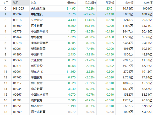 华盛资讯1月26日消息,港股教育股再度重挫。截至发稿,中教控股暴跌21%,现报7.57港元每股,成交额5亿港元;东软教育、民生教育跌超10%;宇华教育跌8.08%;新高教集团跌超7%,新东方-S、希望教育跟跌。