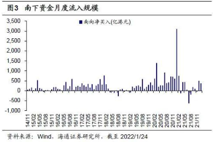 1月南下资金净流入规模为368.4亿港元,截至2022/1/24南下资金有史以来累计净流入额达22216.4亿港元。1月当月南下资金在港股成交额中占比为14.3%,相较于21年12月有所上升。