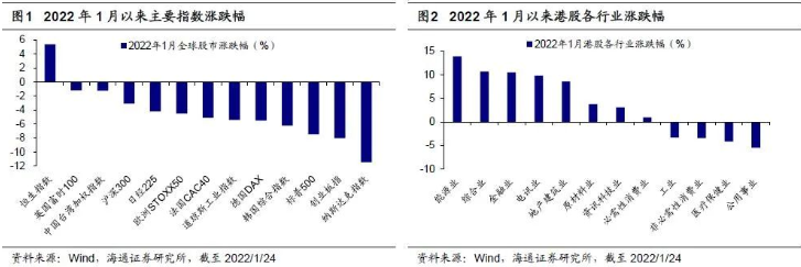 回顾:1月港股反弹后有所回落。1月全球市场大部分指数录得负收益,美股明显回调,但港股表现较为强劲。恒生指数1月反弹后有所回落,截至2022/1/24(下同)当月累计涨跌幅/最大涨跌幅为5.4%/6.8%。对比其他市场,沪深300指数1月累计涨跌幅/最大涨跌幅为-3.1%/0.4%,A股创业板指为-8.0%/0.8%,纳斯达克指数为-11.4%/1.3%,标普500为-7.5%/1.1%,日经225为-4.2%/2.1%,英国富时100为-1.2%/3.2%,德国DAX为-5.5%/2.5%。