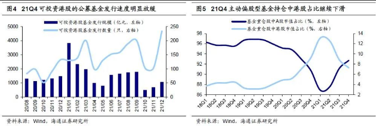 21Q4公募基金继续减持港股,持股集中度有所回升。21Q4可以通过港股通投资港股的公募基金发行速度相较21Q3明显放缓,发行规模为1064.2亿元,环比下降56.6%,发行数量为235只,环比下降19.8%。