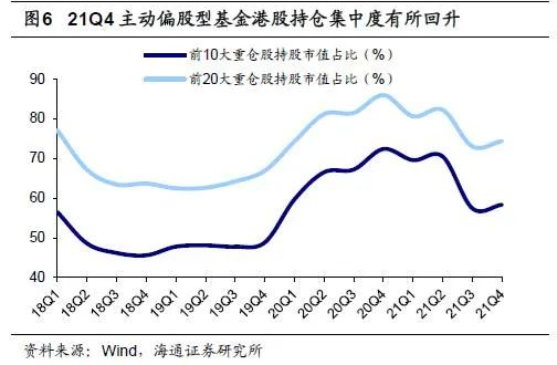 从持股集中度看,21Q4主动偏股型基金重仓股中前10大/前20大重仓股市值占比分别为58.3%/74.4%,相较21Q3环比上升0.9/1.3个百分点,持仓集中度有所提高。总的来看,公募基金对于港股的投资态度整体依然谨慎,结构上持仓向头部集中。