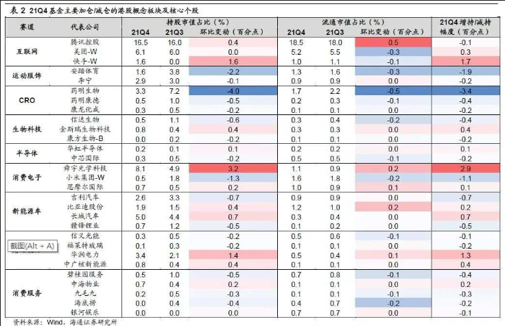 从概念板块角度看,21Q4基金主要加仓港股互联网、消费电子和新能源板块,大幅减仓CRO和运动服饰板块。港股市场的结构性特征较为明显,公募基金的投资方向也通常集中在某个细分领域的少数公司,因此可以结合Wind港股概念板块来分析投资者关注度较高的细分领域及代表性龙头公司的基金仓位变化情况,具体而言: