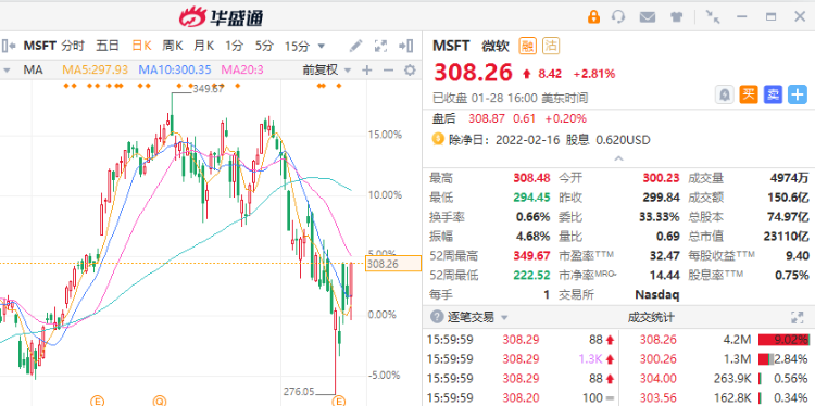 当季微软云服务业务收入同比增长32%达到220亿美元,业绩强劲。但随着基数增大,增速放缓,股价却在盘后交易中一度下跌逾 5%,后有回升,截止发稿前,上涨1.22%。