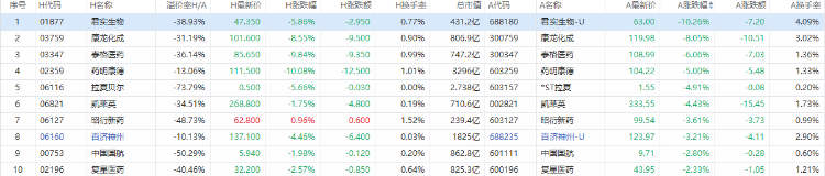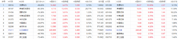 以A股收盘时间,AH股涨幅前10如下: