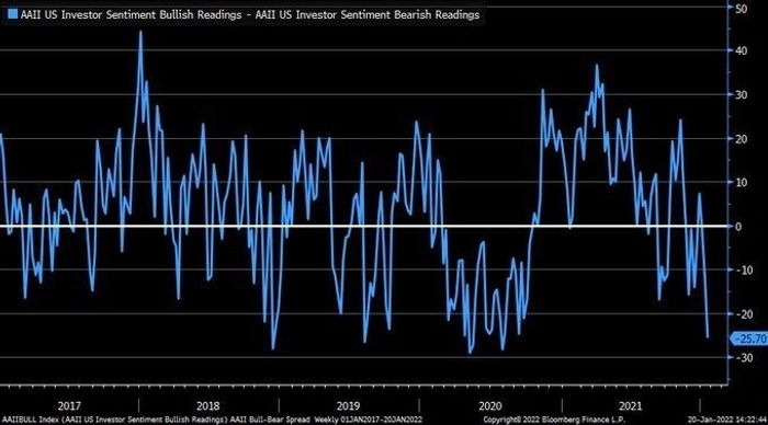 Michael Brush在文章中指出,美国散户协会(AAII)对投资者进行的情绪调查显示,看多情绪指数(Net Bullishness on the AAII Survey)上周降到了-25.7%,接近了疫情期间的低点(-29%)。Michael Brush表示,当这个指标极度看跌时,就是买入的时候了。