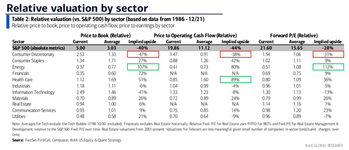 金融和能源板块历来在科技股的抛售行情中表现不错。Michael Brush引用了美银的图表,从相对估值来看,金融、能源等板块均有吸引力。