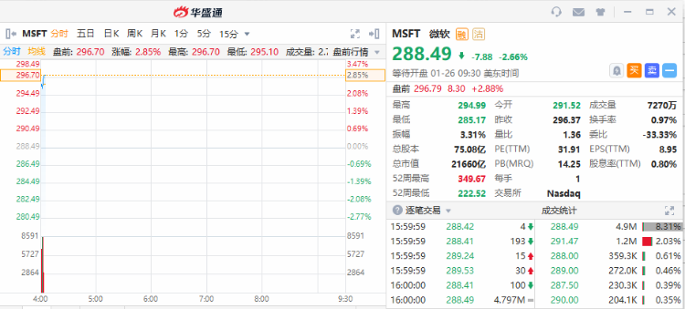 微软(MSFT)涨近3%,公司截至12月31日的第二财政季度营收增长20%,超出市场预期。