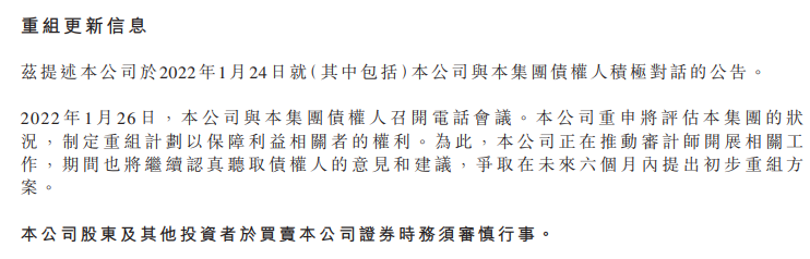 中国恒大:公司计划于未来6个月内推出初步重组方案