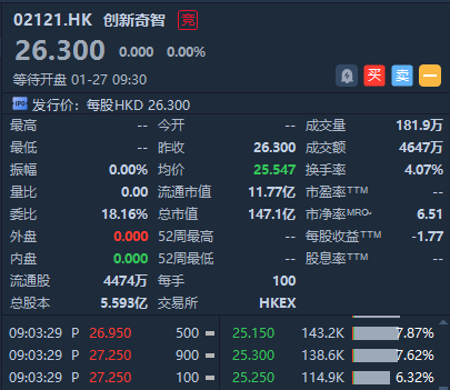 华盛资讯1月27日讯,AI独角兽创新奇智 $02121.HK 首挂平开,盘前成交额4647万港元,最新总市值超147亿港元,昨日华盛通暗盘收跌4.37%。
