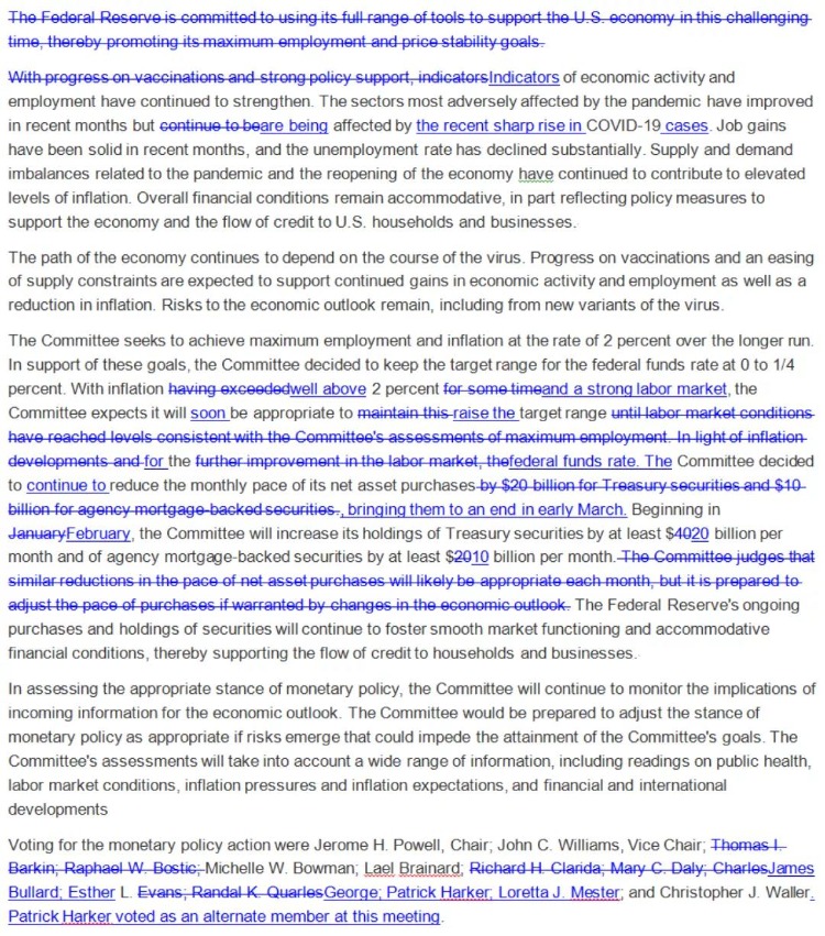 图表:美联储政策声明对比(2022年1月vs 2021年12月)