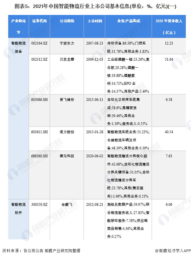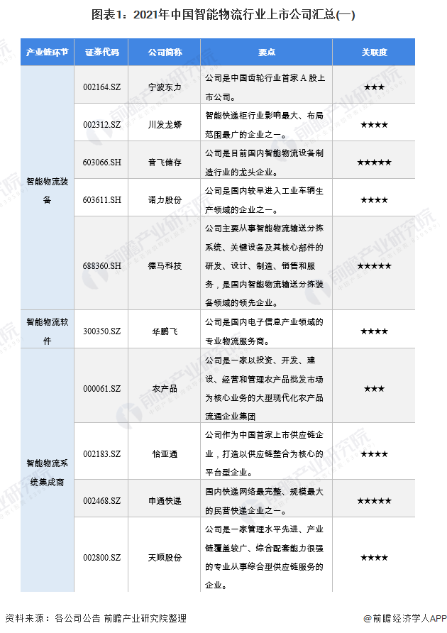 本文汇总了智能物流产业上市公司,具体包括:智能物流装备上市企业:宁波东力(002164.SZ)、川发龙蟒(002312.SZ)、音飞储存(603066.SH)、诺力股份(603611.SH)、德马科技(688360.SH);智能物流软件上市企业:华鹏飞(300350.SZ);智能物流系统集成商上市企业:农产品(000061.SZ)、怡亚通(002183.SZ)、申通快递(002468.SZ)、天顺股份(002800.SZ)、新宁物流(300013.SZ)、科大智能(300222.SZ)、飞力达(300240.SZ)