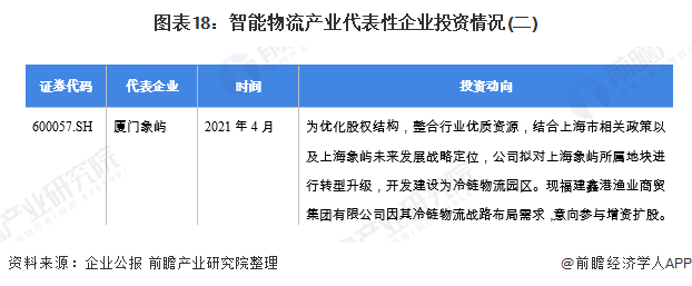 2020年以来,智能物流产业代表性企业的投资动向主要包括签署战略合作协议强强联合、通过对子公司增资的方式投资智能物流相关业务项目。智能物流产业代表性企业最新投资动向如下: