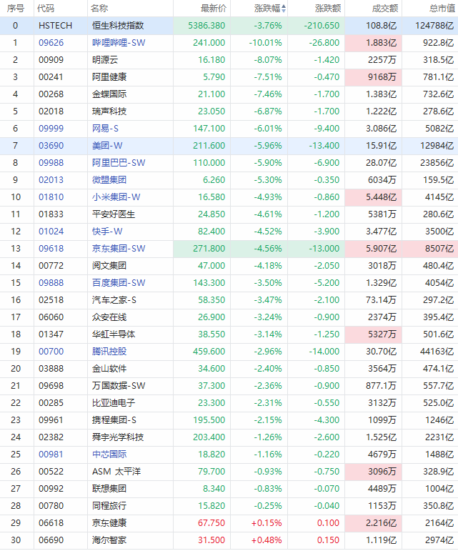 成分股中,科网股走弱。B站跌超10%,报241港元每股,成交额1.88亿港元;网易跌6%;美团、阿里跌超5%;快手、小米跌超4%;腾讯跟跌2.96%。Saas概念股持续下行,明源云跌8.07%,金蝶国际跌7.46%。