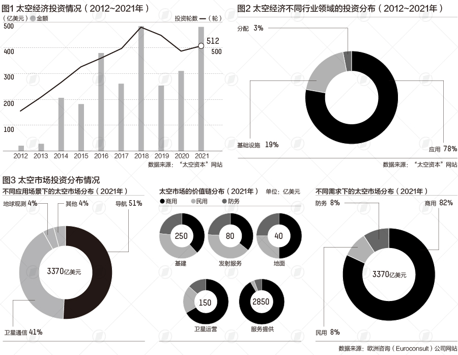 多年追踪“太空经济”(Space Economy)的美国航天技术投资平台太空资本(Space Capital)发布的最新报告显示,2021年全球对太空领域的各项技术投资达463亿美元,且当年的投资总轮数达到512轮。