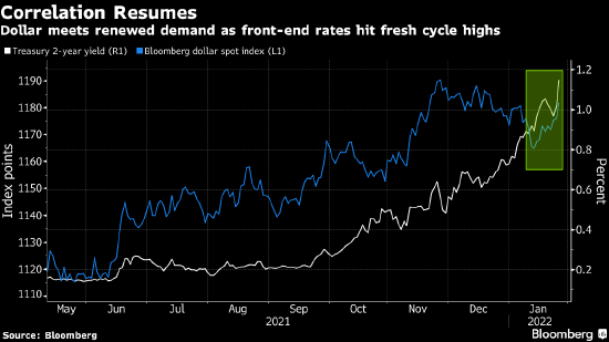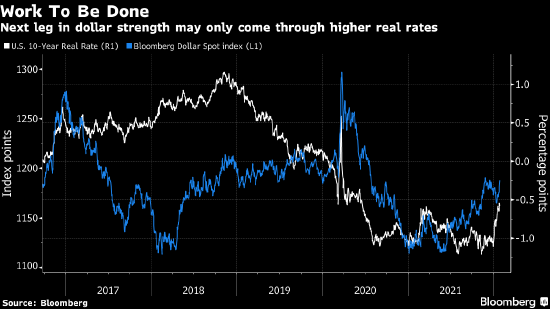 纽约梅隆银行的外汇和宏观策略师John Velis表示实际收益率和美元将继续同步上涨,至少到美联储首次加息。货币市场现在预期美联储将在2022年加息五次,其中第一次是在3月。