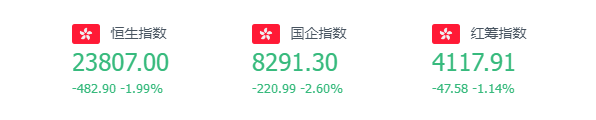截至1月27日周四收盘,恒生指数跌1.99%,报23807.00点;国企指数跌2.60%,红筹指数跌1.14%。恒生科技指数跌3.81%,哔哩哔哩跌9.93%,阿里巴巴跌7.19%,美团跌6.93%,小米集团跌5.50%。