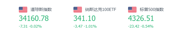 截止周四收盘,道指下跌7.31点,跌幅为0.02%,报34160.78点;纳指跌189.34点,跌幅为1.40%,报13352.78点;标普500指数跌23.42点,跌幅为0.54%,报4326.51点。