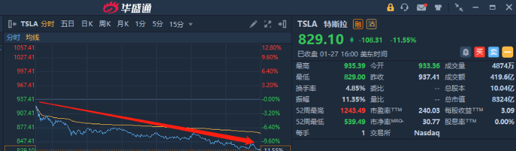 由于电动汽车制造商特斯拉(TSLA.US)公布的第四季度收益和前景未能给投资者留下深刻印象,公司股价大跌11.55%,市值在一天之内蒸发了约7000亿人民币。此前该公司财报电话会议上,马斯克关注点在一款名为Optimus的人形机器人,他表示公司今年不会推出任何新车型。