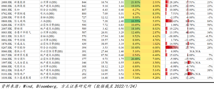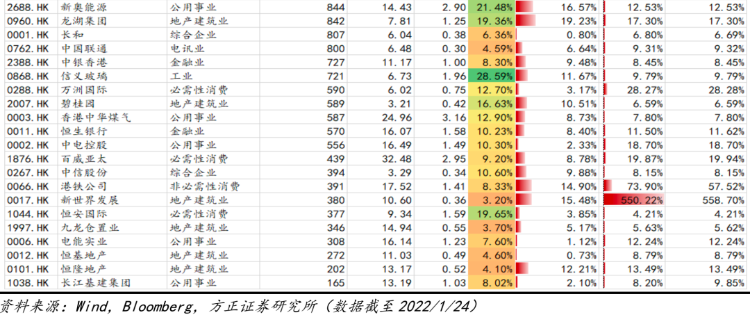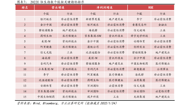 根据彭博数据,2022年预计个股营业收入增速12.80%,其中EBITDA增速为14.89%。根据Wind数据,2022E ROE均值为13.19%。截至2022/1/24,2022E净利润增速比较靠前的恒生个股主要在非必须消费品(银河娱乐、海底捞),资讯科技业(京东、美团),工业板块(信义光能、舜宇光学科技)等。
