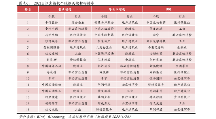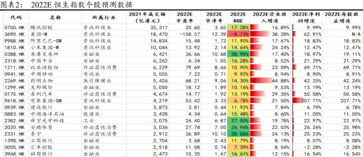 (2)2022年展望:2022年预计恒指成分股的高盈利增速个股主要出现在非必需消费品、资讯科技、工业等板块。