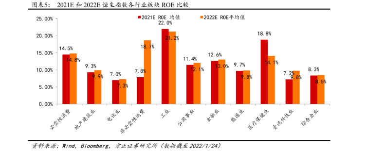 从净资产收益率来看,恒生指数11个细分行业板块中,有9个板块2022年ROE(成分股的ROE均值)预计有所上升。