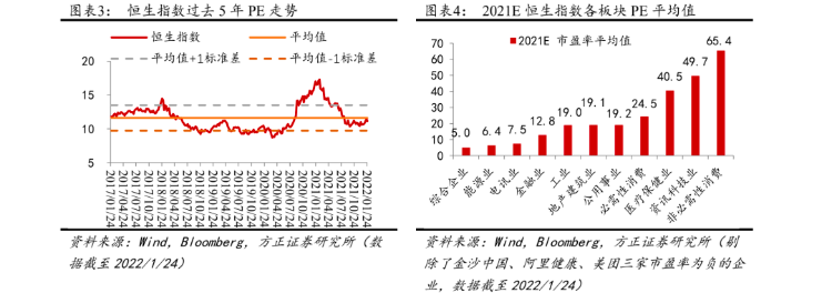 恒生指数目前整体估值仍处于较低水平。从估值层面来看,恒生指数PE目前仅为11.15,整体估值仍处于过去五年历史均值的下方。分行业来看,截至2022/1/24,非必需性消费品、资讯科技业、医疗保健业2021E市盈率靠前,分别为65.4、49.7、40.5。而综合企业、能源业、电讯行业估值较低,分别为5、6.4、7.5。