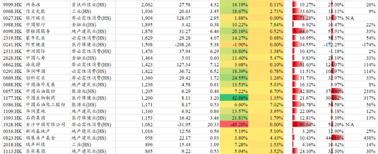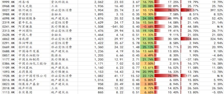 按照关键盈利预测指标为恒生成分股进行排序,对于2022年发现如下值得关注的行业(包括但不限于):