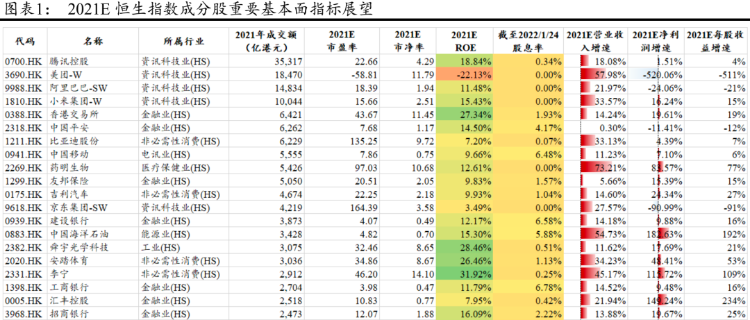 摘要:本报告通过对恒生指数成分股的重要基本面指标进行分析,对于2022年恒生指数成分股有如下结论: