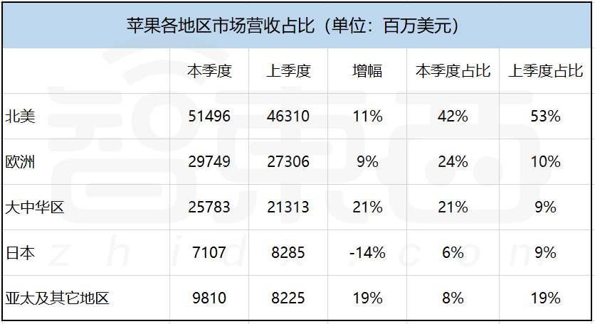 欧洲市场情况也比较类似,营收达到了297亿美元,虽然同比增长只有9%,但是营收占比达到了24%。