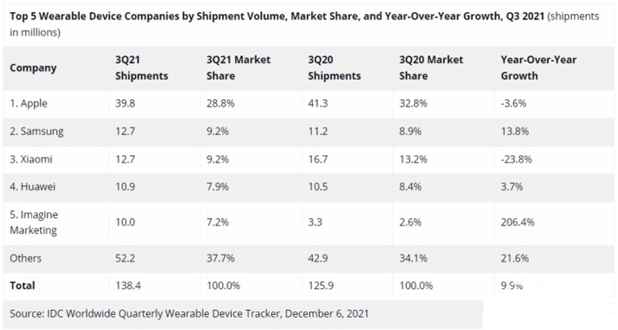 ▲2021年第三季度全球可穿戴市场出货量,来源:IDC