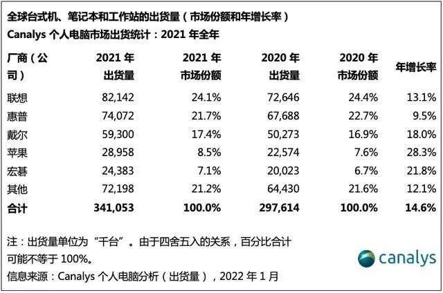 Canalys数据显示,在2021年全球个人电脑市场中,苹果出货量达到了2895万台,同比增长达到了28.3%,市场份额也来到了8.5%,位列第四位。不过值得注意的是,苹果的出货量增速是前五中最高的,并且领先幅度非常明显。