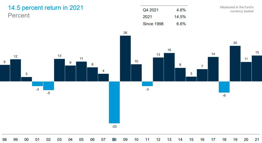 值得一提的是,挪威主权财富基金是最早一批公布2021年投资业绩表现的主权财富基金之一,目前其回报率也超过了其他一些已经公布2021年业绩的知名主权财富基金,例如负责管理香港外汇储备的香港外汇基金(Hong Kong Exchange fund)去年的回报率为3.6%,而阿塞拜疆国家石油基金(Azeri State Oil fund)去年的回报率为3.4%。