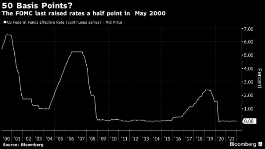 如果需要采取“令人震骇”的方式来应对持续高企的通胀风险,美联储主席杰罗姆·鲍威尔可能会考虑在今年晚些时候实施二十多年来首个0.5个百分点的加息。