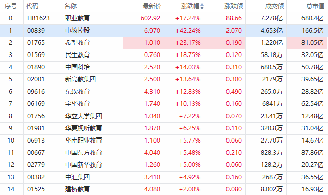 中信证券表示,高教板块业绩兼具高确定性和成长性,我们认为即便考虑政策风险,高教板块也已经被严重低估。建议积极把握当下高教板块的配置机会,重点推荐中教控股、希望教育、东软教育、民生教育以及中国新华教育,建议关注新高教集团、中汇集团、建桥教育、华夏视听教育、华立大学集团、中国科培等公司。