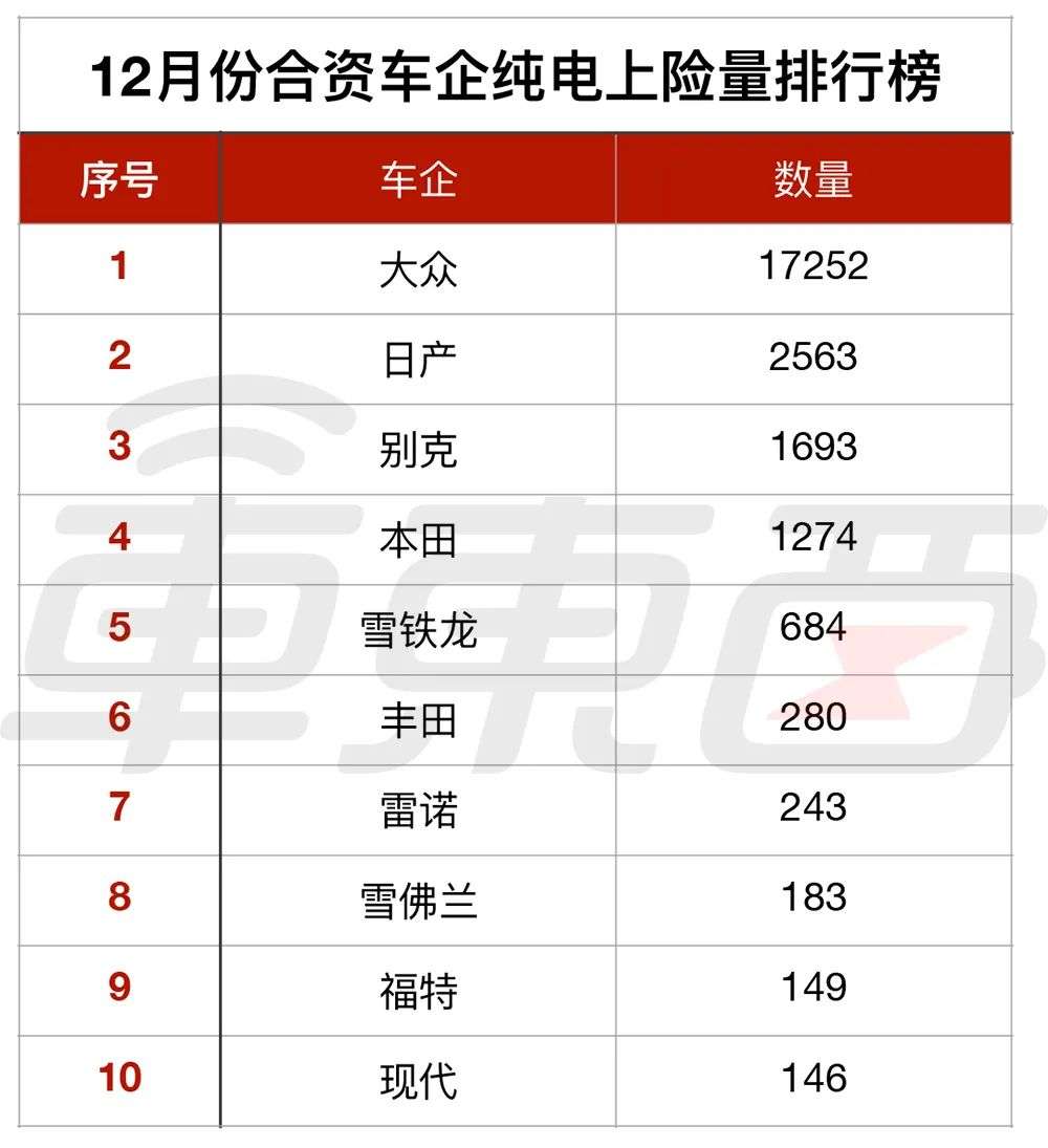 但从上险量来看,大众已经是合资车企唯一的荣光了,其他合资车企的销量都不算出彩,如日产在12月份有2563辆纯电车上险,本田则是1274辆纯电车。