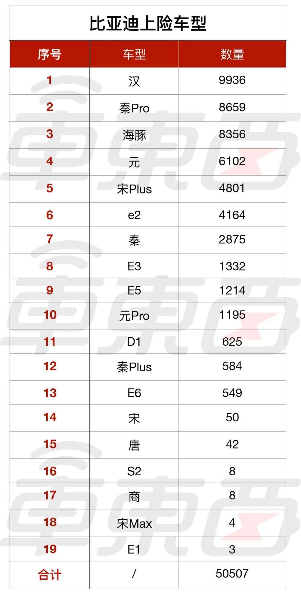 车东西在统计数据时,多次看到比亚迪的车型出现,最终发现比亚迪竟然有19款车都有上险数据,也就是说,比亚迪这5.05万辆的总上险量是19款车的最终成绩。