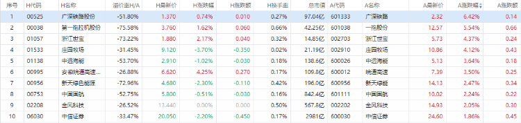 截至发稿,广深铁路股份A股涨6.42%,H股涨0.74%;第一拖拉机股份A股涨5.54%,H股涨1.62%;中远海能A股涨3.64%,H股跌1.02%。