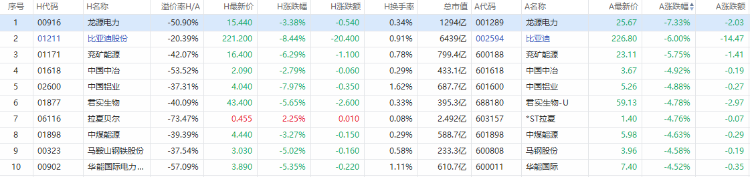 龙源电力A股跌7.33%,H股跌3.38%;比亚迪股份A股跌6%,H股跌8.44%。