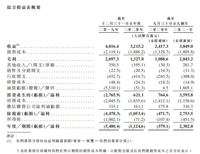 于2019年、2020年12月31日止年度以及2020年、2021年9月30日止九个月公司总收益分别约为48.2亿元人民币、32.2亿元人民币、24.2亿元人民币、38.5亿元人民币;同期,公司净利润分别约为-54.80亿元人民币、-11.2亿元人民币、-5.8亿元人民币、23亿元人民币。
