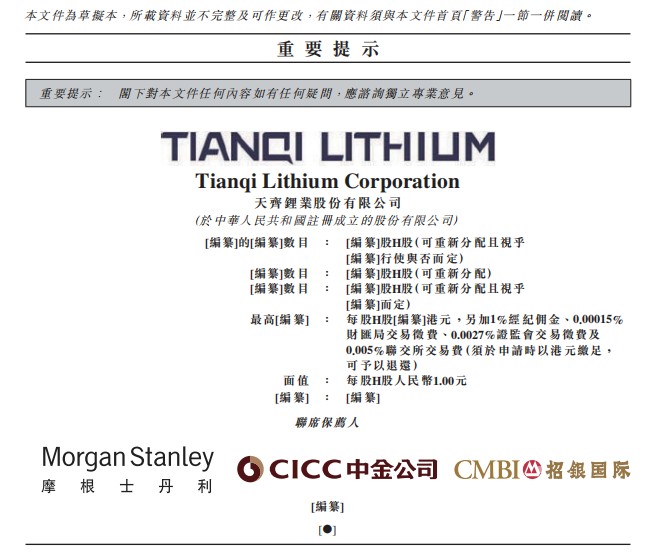 据港交所1月28日披露,天齐锂业股份有限公司(Tianqi Lithium Corporation)向港交所主板递交上市申请,摩根士丹利、中金公司、招银国际为其联席保荐人。据了解,天齐锂业(002460.SZ)目前已在A股上市,总市值约1300亿元。