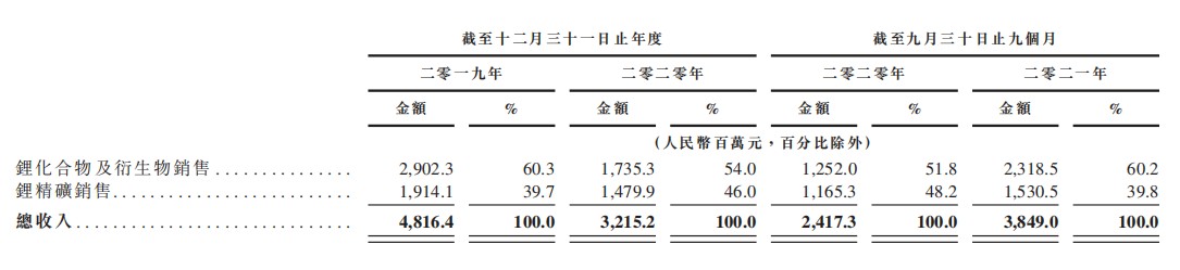 公司的收入产自两个业务分部,即锂化合物及衍生物销售;锂精矿销售。