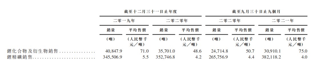 公司锂精矿的销售量于2019年及2020年保持相对稳定。公司锂精矿的销售量由截至2020年9月30日止九个月的65,756.9吨增加至2021年同期的382,118.2吨,主要由于市场对锂精矿的需求增加。公司锂精矿的平均售价于往绩记录期间普遍下降与同期公司用作自身产品定价基准的市场价格一致。