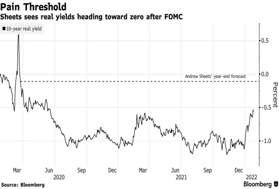 大摩跨资产策略师安德鲁•西茨更坚定认为,今年美股将从全球市场领跑者沦为掉队者,因其难以适应政策收紧的时代。西茨进一步强化了其预期,即经通胀调整后的收益率将从极低负值水平回升至疫情前常态,可能给对利率敏感的成长股带来新的冲击,而成长股驱动着美国的超大盘指数。