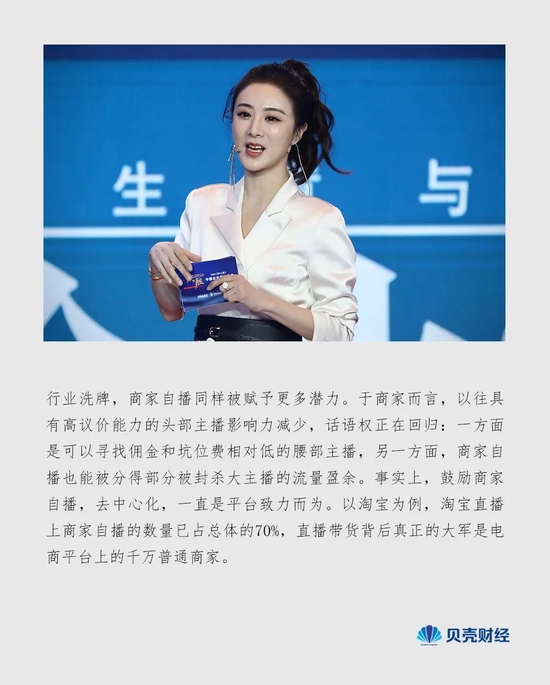 据阿里研究院产业研究中心主任郝建彬透露,以淘宝为例,淘宝直播上商家自播的数量已占总体的70%,直播带货背后真正的大军是电商平台上的千万普通商家。
