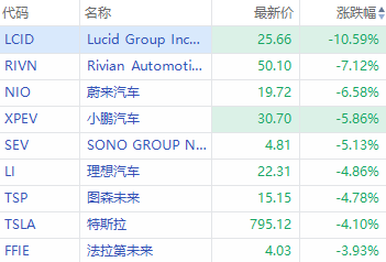 华盛资讯1月28日消息,美股盘初,新能源车板块集体下挫,Lucid $LCID 跌超10%,Rivian跌超7%,蔚来汽车跌超6%,小鹏汽车 $XPEV 跌超5%,理想汽车 $LI 、特斯拉 $TSLA 、图森未来跌超4%。