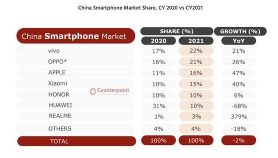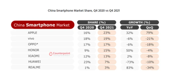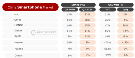 据Counterpoint发布的中国智能手机数据,2021年第二季度,中国市场小米市场份额17%,排在第三(vivo以23%市场份额位居第一、OPPO则以21%位居第二);2021年第三季度,小米的中国市场份额下滑至14%,荣耀反超小米;而在最新发布的2021年第四季度数据,小米中国市场份额进一步下滑,至13%,名次又掉了一位,排在第五,排在苹果、vivo、oppo和荣耀之后。